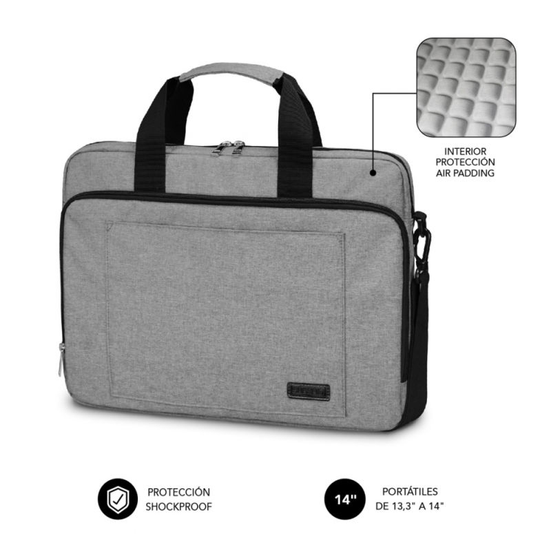 La protección total es una de las principales características del maletín para ordenadores portátiles Subblim Air Padding. En su exclusivo departamento para el ordenador cuenta con un revestimiento de burbujas acolchadas (Air Padding) que proporciona una protección excelente contra golpes o caídas accidentales.Diseñado con múltiples compartimentos. En el bolsillo frontal cuenta con un organizador de accesorios con espacio suficiente y muy fácil de transportar correctamente los artículos de uso diario resultando de gran utilidad para su trabajo o viaje.Gracias a los resistentes materiales de fabricación es capaz de repeler el agua y otros elementos además de presentar resistencia ante los desgarros.En definitiva es un maletín muy cómodo y duradero que resulta ideal para el viaje diario o de negocios gracias a las fuertes asas de transporte, correa de hombro ajustable y correa posterior ajustable a Trolley.Air PaddingInterior reforzado y acolchado mediante una exclusiva tecnología de burbujas acolchadas para proteger tus dispositivos con doble cremallera. Material exterior muy resistente.OrganizadorBolsillo frontal de gran capacidad que te permite el transporte de diversos accesorios como el cargador, cables, etc. Mediante un organizador elástico y otro de mallas.Transporte SeguroGracias a la calidad de las hebillas y correas, el transporte de tu ordenador y accesorios resulta totalmente seguro