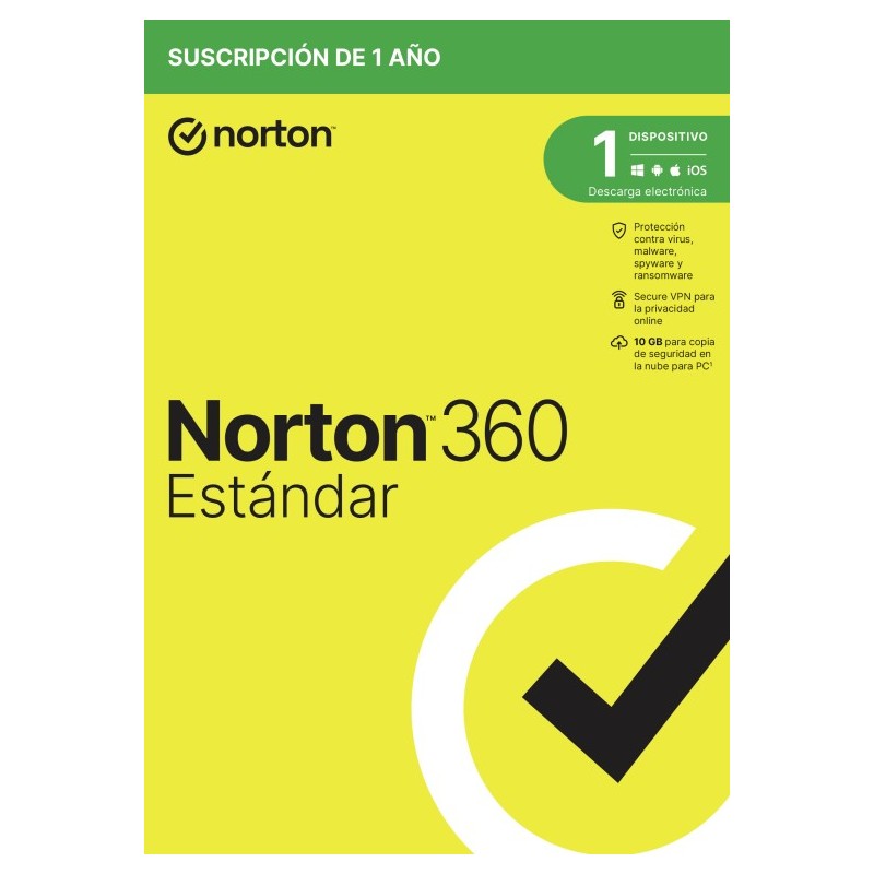 Una gran protección, respaldada por un reembolso completo.Confiamos tanto en nuestra protección contra virus y malware, que incluimos nuestra Promesa de Protección frente a Virus. Si un virus que nuestros expertos no pueden eliminar infecta tu dispositivo, te devolveremos el dinero.Varias capas de protección para tu dispositivo y privacidad online. Y todo en una única solución.Norton 360 Estándar ofrece protección exhaustiva contra malware para un solo PC, Mac, dispositivo Android o iOS. Incluye Copia de seguridad en la nube4, ?? para PC, a fin de impedir la pérdida de datos a causa de ransomware o errores en el disco duro. También proporciona el Gestor de contraseñas para almacenar y administrar las contraseñas.Protección contra amenazas en tiempo realLa seguridad avanzada con antivirus te ayuda a proteger tu dispositivo contra las amenazas online nuevas y emergentes, además, protege tu información confidencial y financiera cuando te conectas a Internet.Secure VPNNavega de manera anónima y más segura con una VPN (red privada virtual) sin registros, y añade cifrado de nivel bancario para ayudar a proteger la privacidad de la información que envías y recibes.Firewall inteligente para PC o firewall para MacSupervisa las comunicaciones entre tu equipo y otros equipos, y ayuda a bloquear el tráfico no autorizado.Gestor de contraseñasHerramientas que facilitan la generación, el almacenamiento y la gestión de tus contraseñas, la información de tarjetas de crédito y otras credenciales online, de una forma más segura.Copia de seguridad en la nube para PCAlmacena tus archivos y documentos importantes como medida preventiva contra la pérdida de datos debida a errores del disco duro, el robo de dispositivos o el ransomware.??,4SafeCam para PCTe avisa de los intentos de acceso a tu cámara web y te ayuda a bloquear el acceso no autorizado.5Norton 360 Estándar incluye además una VPN que permite navegar por Internet de forma más segura y anónima, incluso en redes wifi públicas, y SafeCam5 para PC, que te avisa y ayuda a bloquear el acceso no autorizado a tu cámara web.