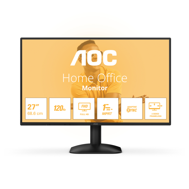 Pantalla Full HD de 27" con 120 Hz y sincronización adaptativaEl AOC 27B31H cuenta con una pantalla Full HD de 27", frecuencia de actualización de 120 Hz, MPRT de 1 ms y sincronización Adaptive Sync. Consigue imágenes fluidas y gran capacidad de respuesta. Con poca luz azul, tecnología sin parpadeo y un diseño sin marco de 3 lados, garantiza comodidad visual y una experiencia visual inmersiva.