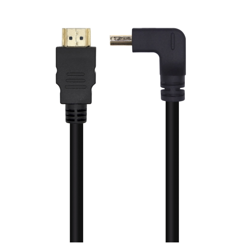 Cable HDMI V2.0 premium alta velocidad con Ethernet con conector tipo A macho acodado en un extremo y conector tipo A macho en el otroIdeal para conectar el cable hdmi en espacio reducidoConectores de alta calidad blindados en oro de 24K. Múltiple apantallamiento para la máxima reducción de posibles interferencias. Fabricado con conductores de cobre (cobre OFC-Oxygen Free Copper- 99,99% de pureza) de alta calidad que garantiza la máxima calidad de transmisión.Retrocompatible con las especificaciones HDMI anteriores y funciona con todos sus dispositivos HDMI existentes.Ancho de banda hasta 18Gbps.Soporta resoluciones de vídeo de hasta 4Kx2K@60Hz (3840x2160p) y profundidad de color 48 bit/px.Compatible con HDR ("High Dynamic Range", alto rango dinámico), lo cual ofrece relaciones de contraste más altas y colores más vivos.Compatible con hasta 32 canales de audio digital no comprimido que ofrecen un sonido impecable.Soporta funcionalidad de canal de retorno de audio.Permite 3D sobre HDMI cuando se conecta a dispositivos HDMI.