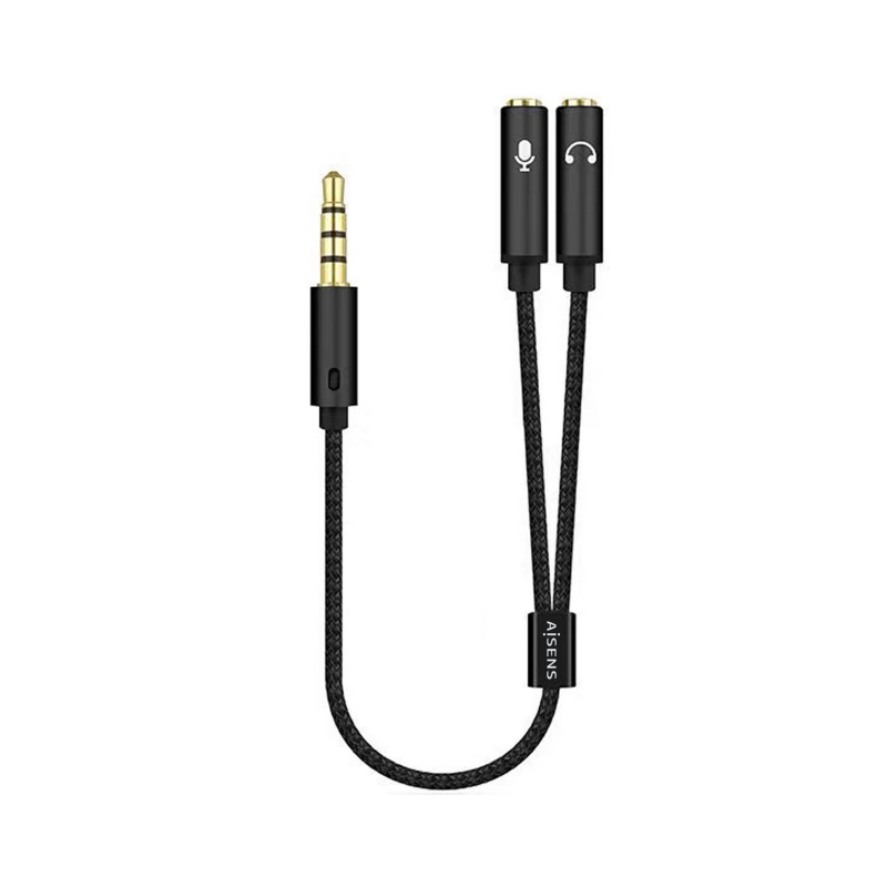 Cable adaptador audio Jack 3.5mm macho de 4 pines en un extremo y 2 jack de 3.5mm hembra de 3 pines en el otroIdeal para conectar auriculares y micrófono a un dispositivo con un puerto de audio de jack 3.5mm de 4 pinesFabricado con conductores de cobre de alta calidad.