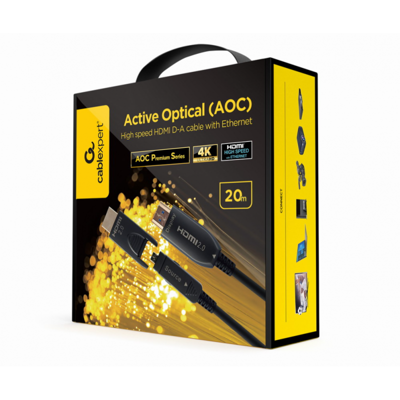 Cable HDMI AOC de alta velocidad blindado premium con Ethernet Admite resoluciones HDMI 2.0 4K UHD a 60 Hz El cable de fibra óptica es altamente resistente a interferencias EMI y RFI Forro de cable blindado extra fuerte Prácticos conectores compactos de metal HDMI-D a HDMI-A Conectores chapados en oro para una calidad de imagen perfecta Compatible con todos los dispositivos compatibles con HDMI