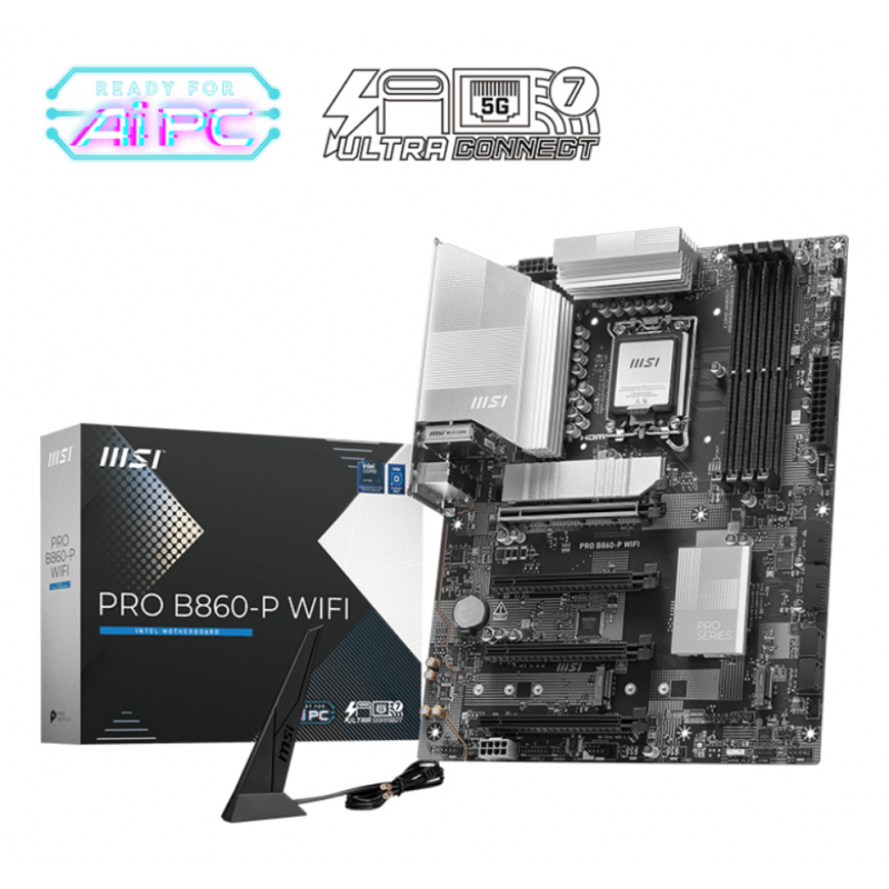 MSI PRO B860-P WIFI. Fabricante de procesador: Intel, Socket de procesador: LGA 1851 (Socket V1), Procesador compatible: Intel Core Ultra (Series 2). tipos de memoria compatibles: DDR5-SDRAM, Memoria interna máxima: 256 GB, Tipo de ranuras de memoria: DIMM. Interfaces de disco de almacenamiento soportados: M.2, Micro SATA III, Tipos de unidades de almacenamiento admitidas: HDD & SSD, Niveles RAID: 0, 1, 5, 10. Tipo de interfaz ethernet: 5 Gigabit Ethernet, Estándar Wi-Fi: Wi-Fi 7 (802.11be), Wi-Fi estándares: 802.11a, 802.11b, 802.11g, Wi-Fi 4 (802.11n), Wi-Fi 5 (802.11ac), Wi-Fi 6 (802.11ax), Wi-Fi 6E.... Componente para: PC, Factor de forma: ATX, Familia del chipset: AMD
