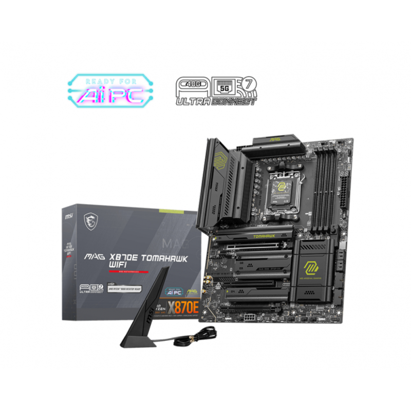 MSI MAG X870E TOMAHAWK WIFI. Fabricante de procesador: AMD, Socket de procesador: Zócalo AM5, Procesador compatible: AMD Ryzen 7000 Series, AMD Ryzen 8000 Series, AMD Ryzen 9000 Series. tipos de memoria compatibles: DDR5-SDRAM, Memoria interna máxima: 256 GB, Tipo de ranuras de memoria: DIMM. Interfaces de disco de almacenamiento soportados: M.2, SATA III, Tipos de unidades de almacenamiento admitidas: HDD & SSD. Tipo de interfaz ethernet: 5 Gigabit Ethernet, Controlador LAN: Realtek RTL8126, Estándar Wi-Fi: Wi-Fi 7 (802.11be). Componente para: PC, Factor de forma: ATX, Familia del chipset: AMD