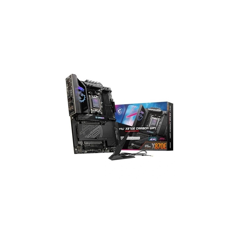 MSI MPG X870E CARBON WIFI. Fabricante de procesador: AMD, Socket de procesador: Zócalo AM5, Procesador compatible: AMD Ryzen? 7. tipos de memoria compatibles: DDR5-SDRAM, Memoria interna máxima: 256 GB, Tipo de ranuras de memoria: DIMM. Interfaces de disco de almacenamiento soportados: M.2, SATA III, Tipos de unidades de almacenamiento admitidas: HDD & SSD. Tipo de interfaz ethernet: 2.5 Gigabit Ethernet, Estándar Wi-Fi: Wi-Fi 7 (802.11be), Wi-Fi estándares: Wi-Fi 7 (802.11be). Componente para: PC, Factor de forma: ATX, Familia del chipset: AMD