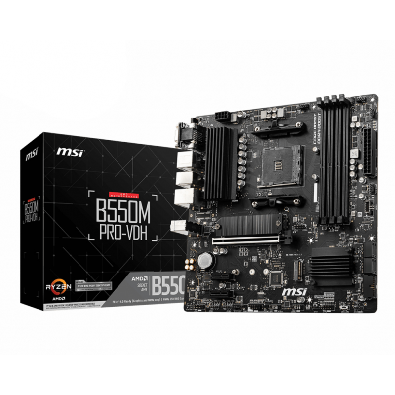 MSI B550M PRO-VDH. Fabricante de procesador: AMD, Socket de procesador: Zócalo AM4, Procesador compatible: AMD Ryzen 3000 Series. tipos de memoria compatibles: DDR4-SDRAM, Memoria interna máxima: 128 GB, Tipo de ranuras de memoria: DIMM. Interfaces de disco de almacenamiento soportados: SATA III, Tipos de unidades de almacenamiento admitidas: HDD & SSD, Niveles RAID: 0, 1, 10. Máxima resolución: 4096 x 2160 Pixeles. Tipo de interfaz ethernet: Gigabit Ethernet, Controlador LAN: Realtek 8111HN