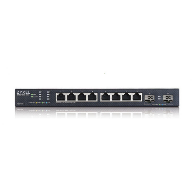 Zyxel XMG1915-10E. Tipo de interruptor: Gestionado, Capa del interruptor: L2. Puertos tipo básico de conmutación RJ-45 Ethernet: 2.5G Ethernet (100/1000/2500), Cantidad de puertos básicos de conmutación RJ-45 Ethernet: 8. Tabla de direcciones MAC: 16000 entradas, Capacidad de conmutación: 80 Gbit/s. Estándares de red: IEEE 802.1p, IEEE 802.3ab, IEEE 802.3ae, IEEE 802.3at, IEEE 802.3az, IEEE 802.3bt, IEEE 802.3bz,.... Montaje en rack