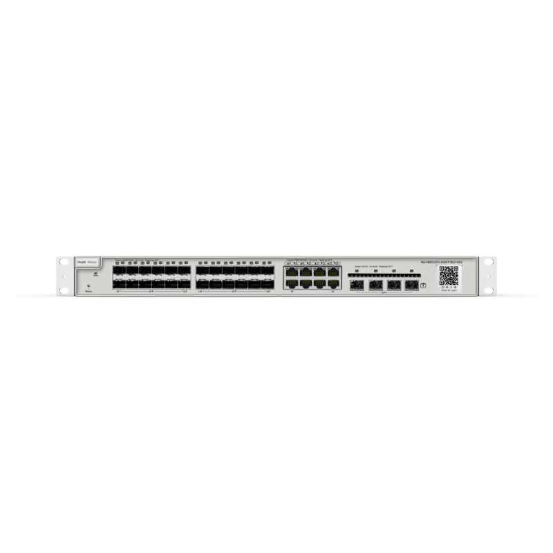 Ruijie Networks RG-NBS3200-24SFP/8GT4XS. Tipo de interruptor: Gestionado, Capa del interruptor: L2. Puertos tipo básico de conmutación RJ-45 Ethernet: Gigabit Ethernet (10/100/1000), Cantidad de puertos básicos de conmutación RJ-45 Ethernet: 8. Tabla de direcciones MAC: 16000 entradas, Capacidad de conmutación: 128 Gbit/s. Montaje en rack