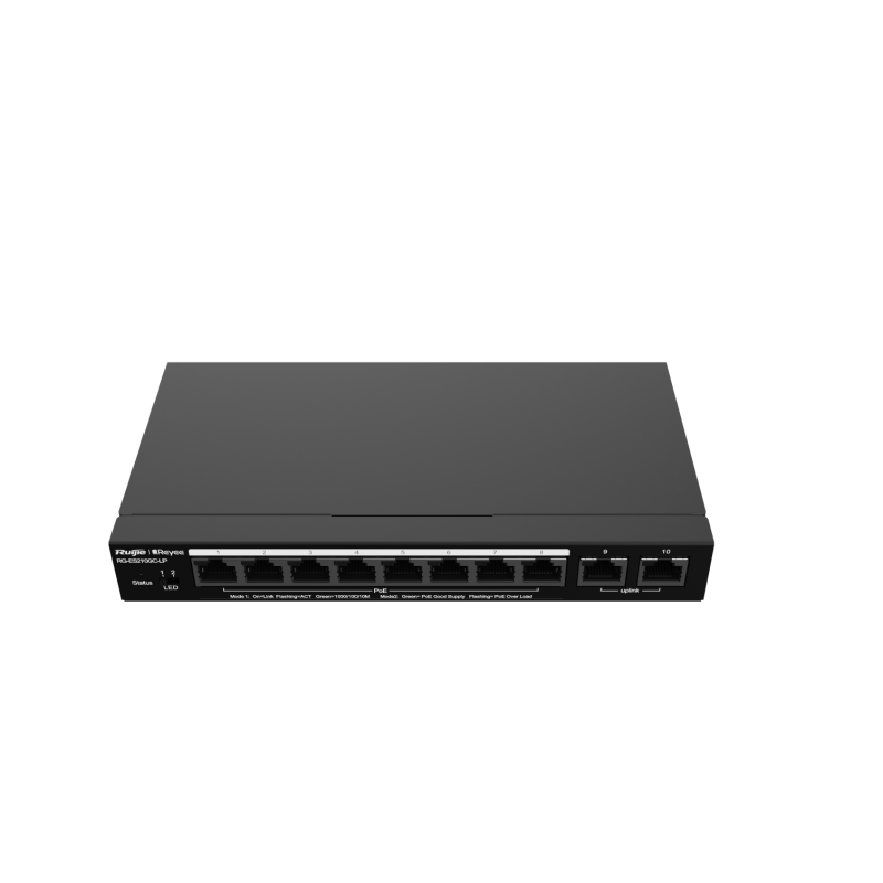 RG-ES210GC-LPConmutador administrado de 10 puertos Gigabit con 8 puertos PoE+El conmutador PoE de acceso Gigabit se adapta a las necesidades de la red SMBConmutadores administrados en la nube inteligentes y rentablesEl ES200 adopta un diseño de gestión de nube ligero, que proporciona una respuesta más rápida para admitir funciones más completas.Valor único para la red de CCTVLa prevención automática de bucles garantiza la continuidad del servicioLa red permanece conectada cuando se produce un bucle de red