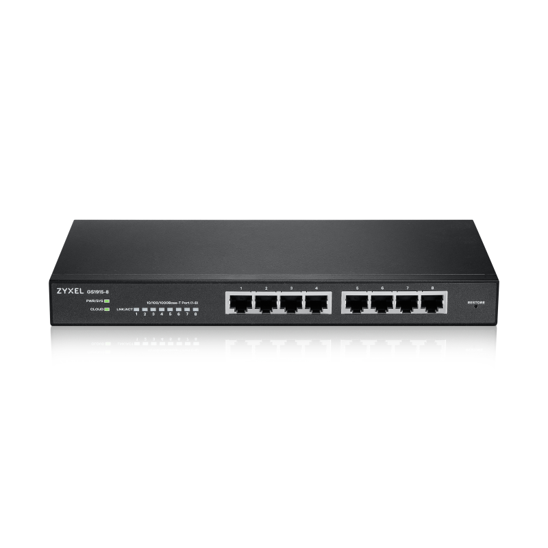 Zyxel GS1915-8. Tipo de interruptor: Gestionado, Capa del interruptor: L2. Puertos tipo básico de conmutación RJ-45 Ethernet: Gigabit Ethernet (10/100/1000), Cantidad de puertos básicos de conmutación RJ-45 Ethernet: 8. Bidireccional completo (Full duplex). Tabla de direcciones MAC: 8000 entradas, Capacidad de conmutación: 16 Gbit/s. Estándares de red: IEEE 802.1Q, IEEE 802.1p, IEEE 802.1x, IEEE 802.3, IEEE 802.3ab, IEEE 802.3ad, IEEE 802.3af, IEEE.... Conector eléctrico: Conector de alimentación AC-in