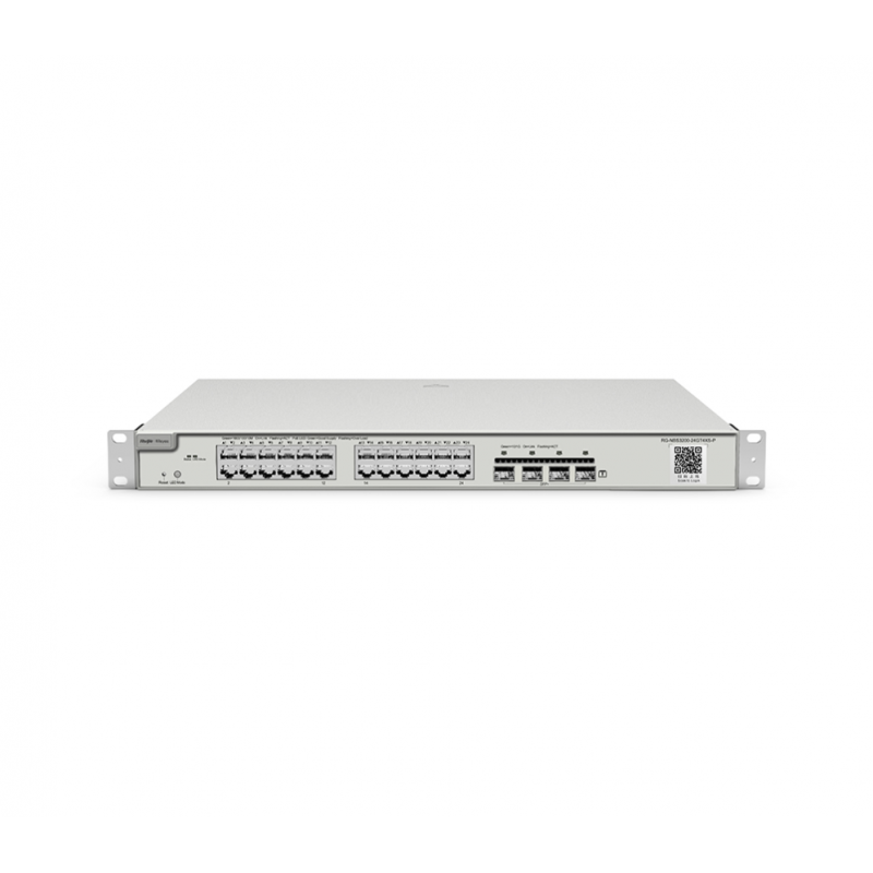 Ruijie Networks RG-NBS3200-24GT4XS-P. Tipo de interruptor: Gestionado, Capa del interruptor: L2. Puertos tipo básico de conmutación RJ-45 Ethernet: Gigabit Ethernet (10/100/1000), Cantidad de puertos básicos de conmutación RJ-45 Ethernet: 24. Tabla de direcciones MAC: 16000 entradas, Capacidad de conmutación: 336 Gbit/s. Energía sobre Ethernet (PoE). Montaje en rack