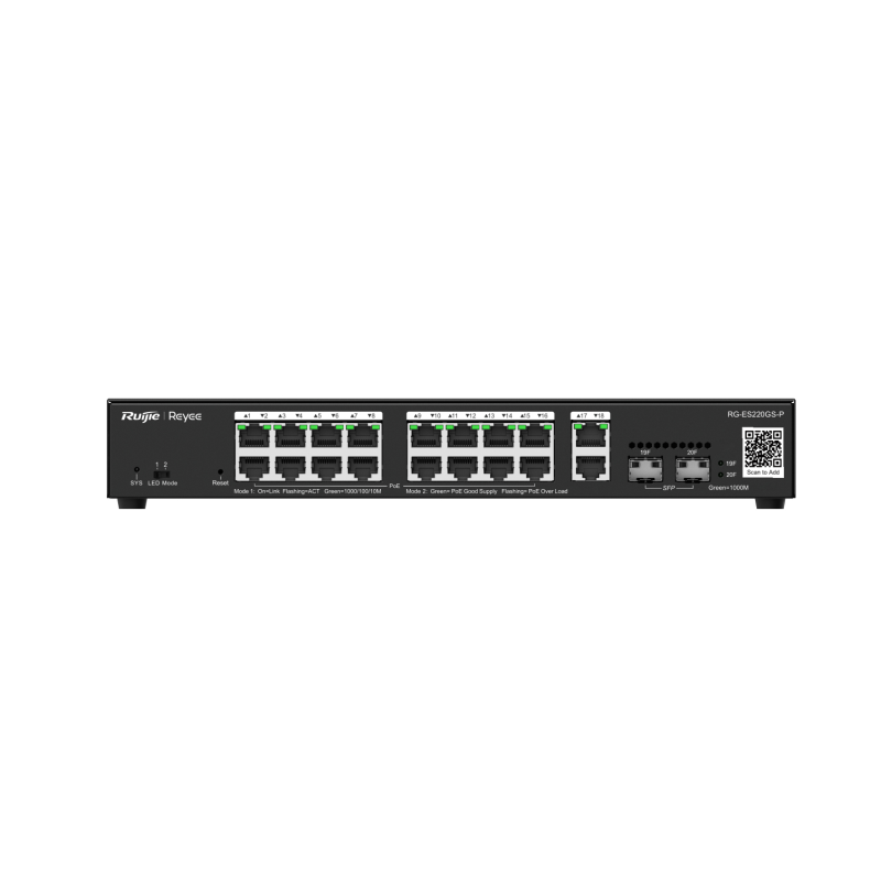 Ruijie Networks RG-ES220GS-P. Tipo de interruptor: Gestionado, Capa del interruptor: L2. Puertos tipo básico de conmutación RJ-45 Ethernet: Gigabit Ethernet (10/100/1000), Cantidad de puertos básicos de conmutación RJ-45 Ethernet: 18. Tabla de direcciones MAC: 8000 entradas, Capacidad de conmutación: 40 Gbit/s. Estándares de red: IEEE 802.3af, IEEE 802.3at. Energía sobre Ethernet (PoE)