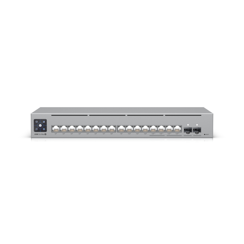 Ubiquiti Pro Max 16 PoE. Tipo de interruptor: Gestionado, Capa del interruptor: L3. Puertos tipo básico de conmutación RJ-45 Ethernet: Gigabit Ethernet (10/100/1000), Cantidad de puertos básicos de conmutación RJ-45 Ethernet: 16. Capacidad de conmutación: 84 Gbit/s. Estándares de red: IEEE 802.1x. Voltaje de entrada DC: 44 - 57 V. Conector eléctrico: Toma de entrada de CC. Energía sobre Ethernet (PoE). Montaje en rack