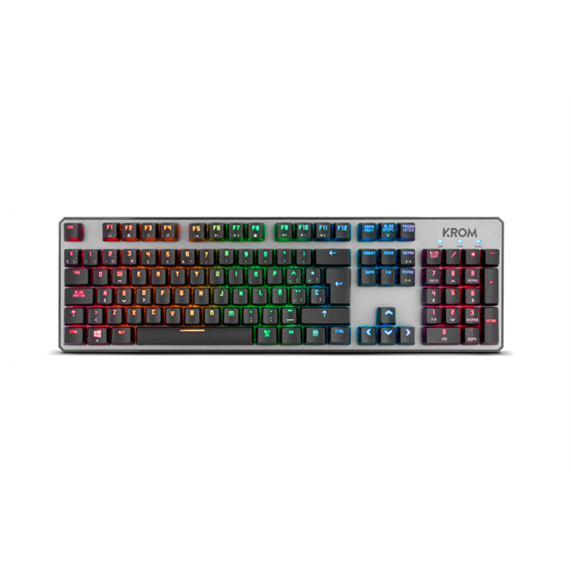 Krom Kernel llega para satisfacer todas tus necesidades como gamer, gracias a sus switches mecánicos de alta calidad y sus 16.8 millones de colores con los que cada pulsación dejará huella.Al no necesitar de software adicional, podrás disfrutar al momento de las prestaciones de este teclado mecánico y elegir entre diferentes modos de iluminación usando solo combinaciones de teclado. Si tus juegos son diferentes, tu forma de jugar también puede serlo con Krom Kernel.Diseño e iluminaciónKernel posee un panel superior de aluminio con dos pestañas elevadoras que te ayudarán a adaptarlo a la altura que necesites. Su sólida estructura te aportará estabilidad en cada movimiento y resistencia frente al paso del tiempo.El diseño sin reposamuñecas de Kernel está pensado para que puedas llevarlo contigo a cualquier sitio, ya sean eventos, competiciones o quedadas con amigos.Kernel cuenta con iluminación RGB en cada switch y 9 efectos de iluminación totalmente personalizables: podrás cambiar la velocidad e intensidad de cada efecto y ver cada tecla con un golpe de vista gracias a la intensidad de su iluminación LED.Opciones cromáticasCrear tus propios colores en Kernel es sencillo y lo conseguirás con simples atajos de teclado. Pulsa 5 segundos las teclas FN + Imprimir Pantalla: se iluminarán automáticamente las teclas Suprimir (color Rojo), Fin (color Verde) y Avance Página (color Azul). Con ellas y con las teclas Insert, Inicio y Re Página podrás moverte por el espectro cromático, elegir el tono que más te guste y guardarlo usando de nuevo la combinación FN + Imprimir Pantalla.Si en cualquier momento quieres volver a la configuración original de tu teclado Kernel, solo pulsa FN + ESC y, a continuación, pulsa consecutivamente, F1, F3 y F5.PrestacionesKernel cuenta con prestaciones de gama alta: podrás asignar funciones macros a cualquier tecla, disfrutando de una pulsación suave y efectiva gracias a sus switches mecánicos.Gracias a su Modo Gaming (que desactiva la tecla Windows), su sistema anti ghosting y sus 11 teclas con función multimedia, disfrutarás de sesiones de juego fluidas y sin interrupciones.Su cable es trenzado, por lo que la resistencia y durabilidad de tu teclado Kernel está asegurada.Switches mecánicosLos teclados mecánicos están basados en una tecnología individual, lo que da como resultado experiencias de pulsaciones totalmente unitarias, incrementando así el rendimiento de tu experiencia de gaming o de escritura en comparación con otros teclados.ConfiguraciónLos atajos de teclado son nuestro mejor aliado con Kernel, ya que no necesita de software adicional para ser configurado. Todas las posibilidades de iluminación de Kernel, así como las macros, podrás configurarlas mediante una sencilla combinación de teclas.