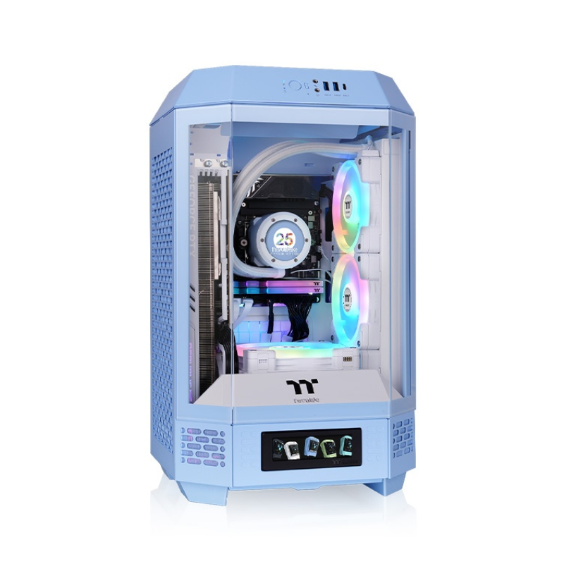 Thermaltake The Tower 250 Hydrangea Blue. Factor de forma: Mini Tower, Tipo: PC, Color del producto: Azul. Tipo de visualizador: LCD, Diagonal de la pantalla: 9,91 cm (3.9"), Resolución de la pantalla: 128 x 480 Pixeles. Ventiladores frontales instalados: 2x 120 mm, Diámetro de ventiladores frontales soportados: 120 mm, Diámetro de ventiladores secundarios soportados: 120,140 mm. Tamaños de disco duro soportados: 2.5,3.5". Ancho: 300 mm, Profundidad: 281 mm, Altura: 506 mm