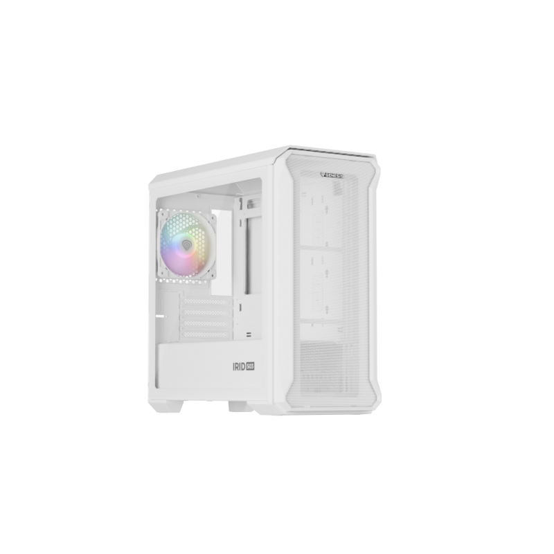 GENESIS Irid 503. Factor de forma: Mini Tower, Tipo: PC, Color del producto: Transparente, Blanco. Ubicación de fuente de alimentación: Fondo. Diámetro de ventiladores frontales soportados: 120,140 mm, Ventiladores traseros instalados: 1x 120 mm, Diámetro de ventiladores traseros soportados: 120 mm. Tamaños de disco duro soportados: 2.5,3.5". Ancho: 210 mm, Profundidad: 430 mm, Altura: 430 mm