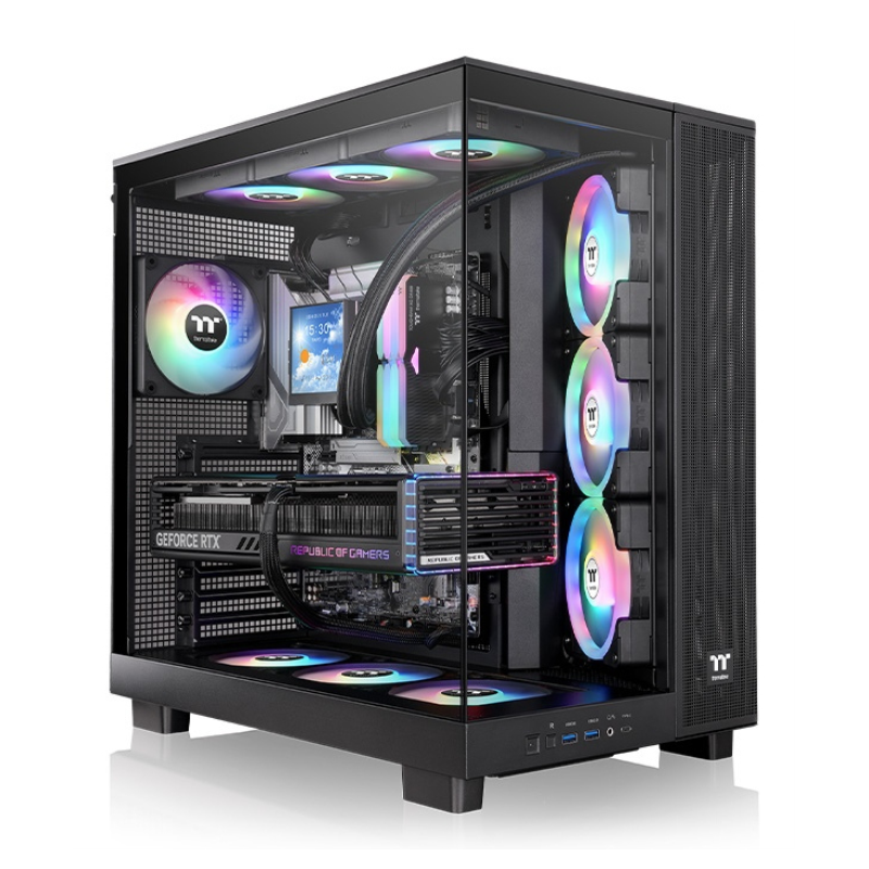 Thermaltake View 380 XL TG ARGB. Factor de forma: Midi Tower, Tipo: PC, Color del producto: Negro. Factores de forma de la fuente de alimentación compatibles: PS2. Ventiladores laterales instalados: 3x 120 mm, Diámetro de ventiladores secundarios soportados: 120 mm, Ventiladores traseros instalados: 1x 120 mm. Tamaños de disco duro soportados: 3.5", Factor de forma de disco SSD: 2.5". Ancho: 288 mm, Profundidad: 469 mm, Altura: 471 mm